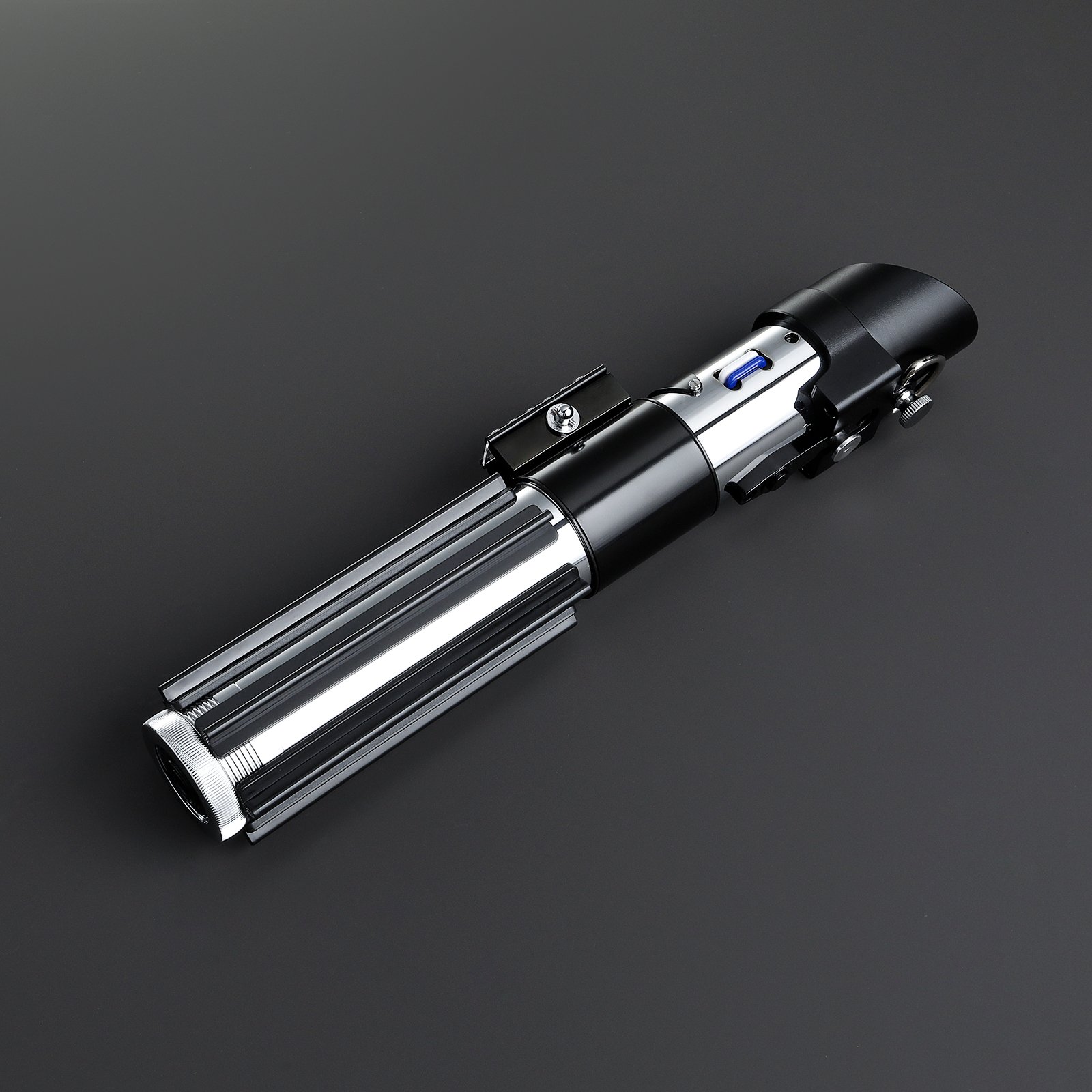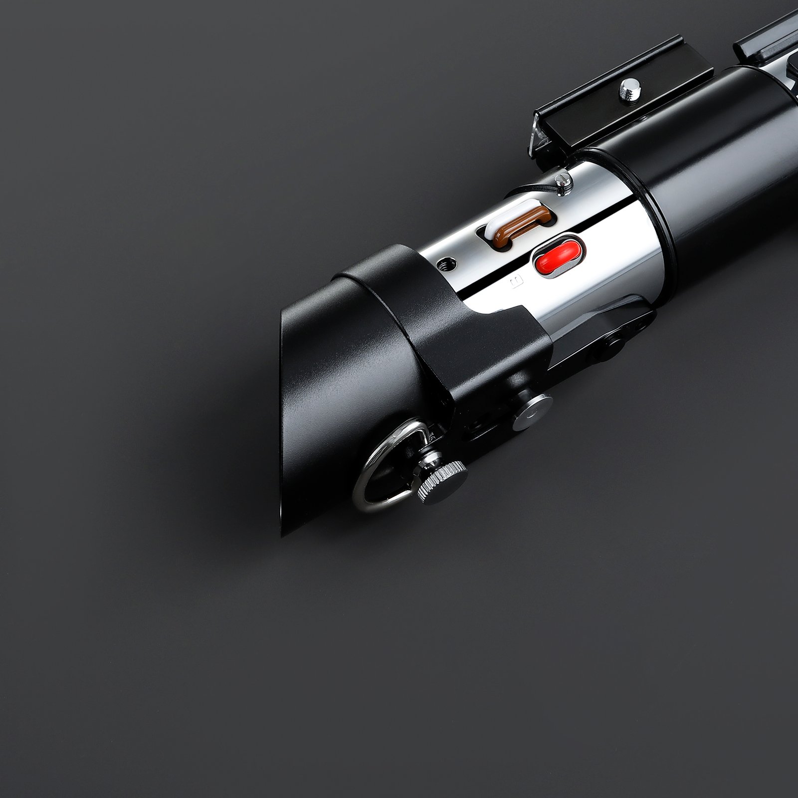 Su empuñadura metálica negra y plateada reproduce fielmente el diseño clásico del Lord Sith, combinando elegancia con una sensación de poder absoluto.