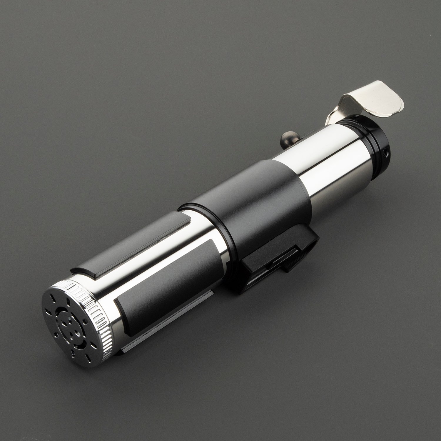 Su empuñadura metálica plateada con detalles negros ha sido recreada con precisión artesanal, manteniendo la fidelidad al diseño original visto en las películas.
